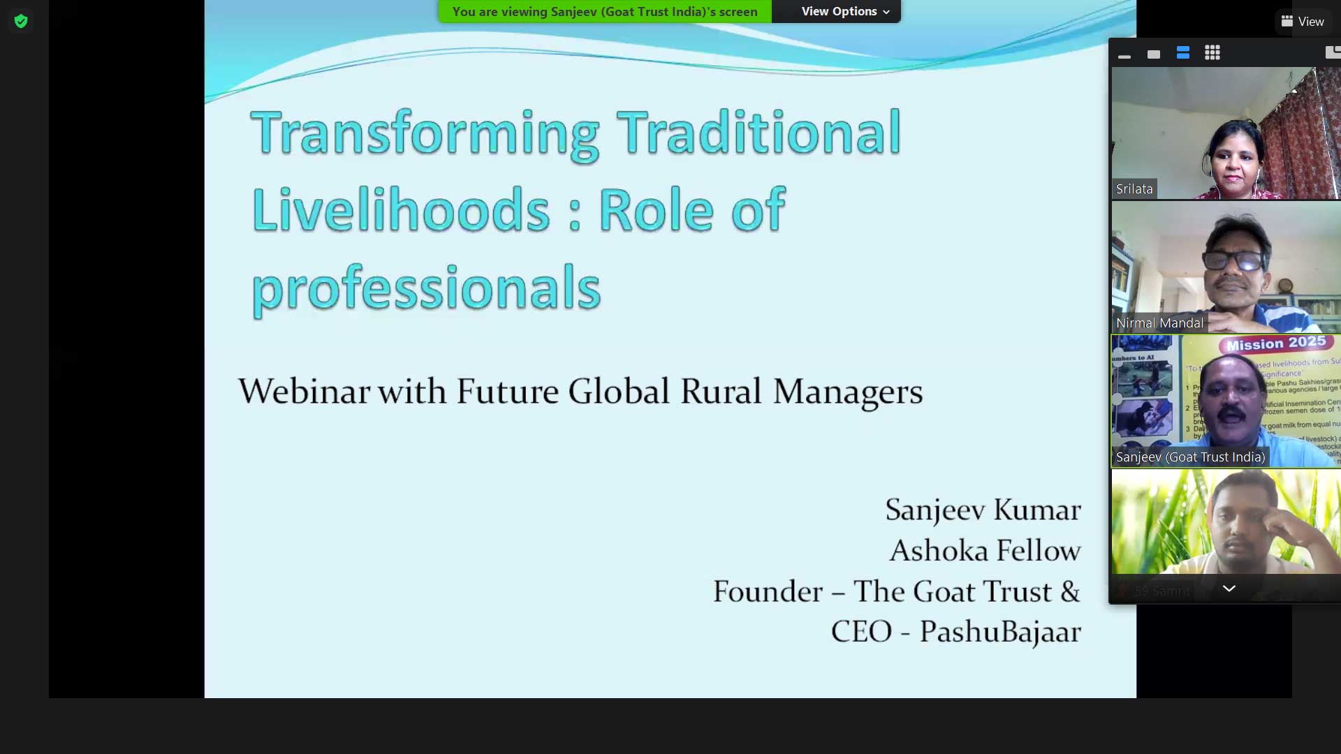 The speaker for the webinar was Dr. Sanjeev Kumar, Founder, The Goat Trust. Mr. Kumar initiated his talk with the idea of fear to freedom and shared that the less fear you have, the more free you are. He then shared his journey from BHU to setting up the Goat Trust. He highlighted the role of management professionals like identifying the problems, cause of the problems, finding out solutions and testing the solutions before scaling up. Mr. Kumar shared about the technology breakthrough by the organization. Further, he stressed on what it takes to scale up like partnership, collaboration, demystification of technology, making it cost affordable, learning from the context, valuing local wisdom and nurturing team. In the livelihood context institutions, technology market and financial services are crucial areas. Mr. Kumar emphasized that it is important to innovate to transform and sustain.
